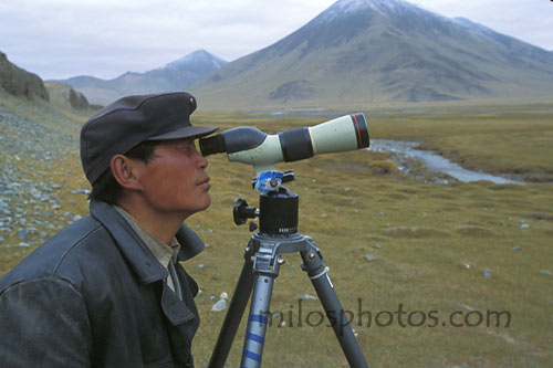 Mongol herder watching argali rams through my spotting scope - Yeniugou